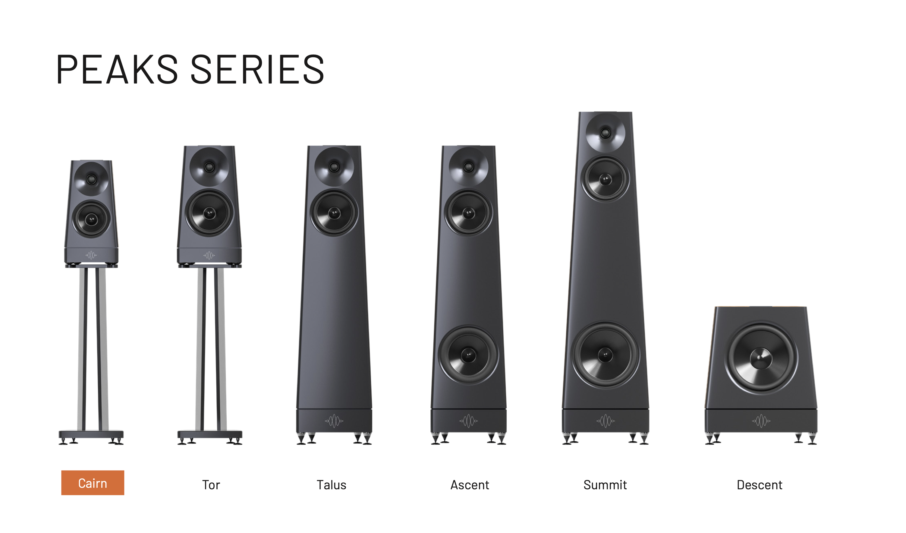 '피크'라는 이름은 콜로라도의 로키 산맥의 봉우리들을 의도한 것이며, 6종류의 모델로 구성되어 있는데, 그 이름은 하나 하나가 산에 오르는 과정을 의미하도록 지어졌다. 가장 작은 스피커인 커른(Cairn)은 길의 시작을 알리는 돌로 쌓여진 이정표이며, 그 다음은 구릉지대인 토르(Tor), 완경사면인 탤러스(Talus)를 거쳐 오르막길인 어센트(Ascent), 마지막으로 정상인 서밋(Summit)에 도달한다. 그리고 서브우퍼는 지하를 의도하는 디센트(descent)라는 이름을 붙였다. 서브우퍼를 추가한 것은 특히 북셀프 타입 스피커 등의 저음을 더 보강하기를 원하는 경우에 대응하려는 의미이며, 특별히 홈시어터의 적용을 염두에 둔 것은 아니라고 한다.